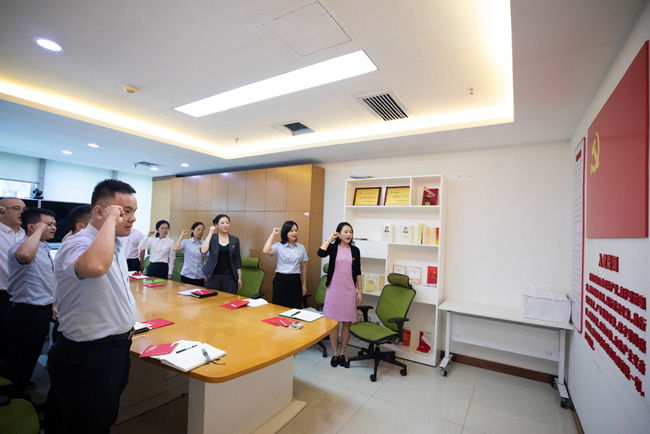 “我志愿加入中國共產(chǎn)黨……隨時準備為黨和人民犧牲一切,永不叛黨。”在公司黨委委員、紀委書記廖紅梅的帶領下,13位公司本部黨員代表列隊肅立,高舉右拳,面對鮮紅的黨旗重溫入黨誓詞,再次莊嚴宣誓,鏗鏘誓詞,強烈震撼著在場每一位黨員;錚錚誓言,充分激發(fā)奮斗初心使命,升華黨員覺悟,進一步堅定了對黨的赤膽忠心和為共產(chǎn)主義事業(yè)奮斗終身的強烈決心。