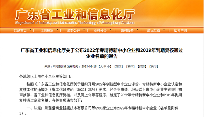 同時,根據(jù)廣東省工業(yè)和信息化廳發(fā)布的《關于公布2022年專精特新中小企業(yè)和2019年到期復核通過企業(yè)名單的通知》,鐵漢環(huán)保被認定為廣東省2022年度專精特新中小企業(yè),有效期自公布之日起三年。“專精特新”中小企業(yè)是指實現(xiàn)專業(yè)化、精細化、特色化發(fā)展、創(chuàng)新能力強、質(zhì)量效益好的優(yōu)質(zhì)企業(yè)。本次“專精特新”中小企業(yè)評選是廣東省工信廳基于從事特定細分市場年限、研發(fā)費用總額、研發(fā)強度、營業(yè)收入等基本條件,選拔出創(chuàng)新能力強、市場占有率高、質(zhì)量效益優(yōu)的排頭兵。