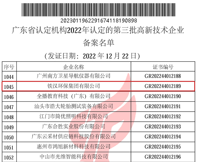 日前,中節(jié)能鐵漢環(huán)保集團有限公司(以下簡稱鐵漢環(huán)保)收到全國高新技術企業(yè)認定管理工作領導小組辦公室發(fā)布的《關于對廣東省認定機構2022年認定的第三批高新技術企業(yè)進行備案的公告》,根據(jù)《廣東省認定機構2022年認定的第三批高新技術企業(yè)備案名單》,鐵漢環(huán)保已通過高新技術企業(yè)認定。這是自2016年起,鐵漢環(huán)保連續(xù)第三次通過國家高新技術企業(yè)認定。
