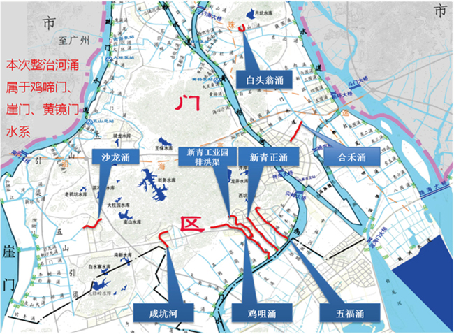項(xiàng)目位于珠海市斗門(mén)區(qū),施工范圍分布在三個(gè)鎮(zhèn)區(qū),由8條河涌組成,分別為白蕉鎮(zhèn)白頭翁涌、合禾涌,井岸鎮(zhèn)五福涌、新青正涌、新青工業(yè)園排洪渠、雞咀涌,乾務(wù)鎮(zhèn)咸坑河、沙龍涌。工程主要建設(shè)內(nèi)容涵蓋河道控源截污工程、內(nèi)源清淤及底質(zhì)改良工程、面源污染控制工程、水生態(tài)凈化工程、生態(tài)景觀提升工程、改善河道水動(dòng)力工程、智慧水務(wù)系統(tǒng)建設(shè)工程、應(yīng)急工程等,總治理長(zhǎng)度21.05公里。